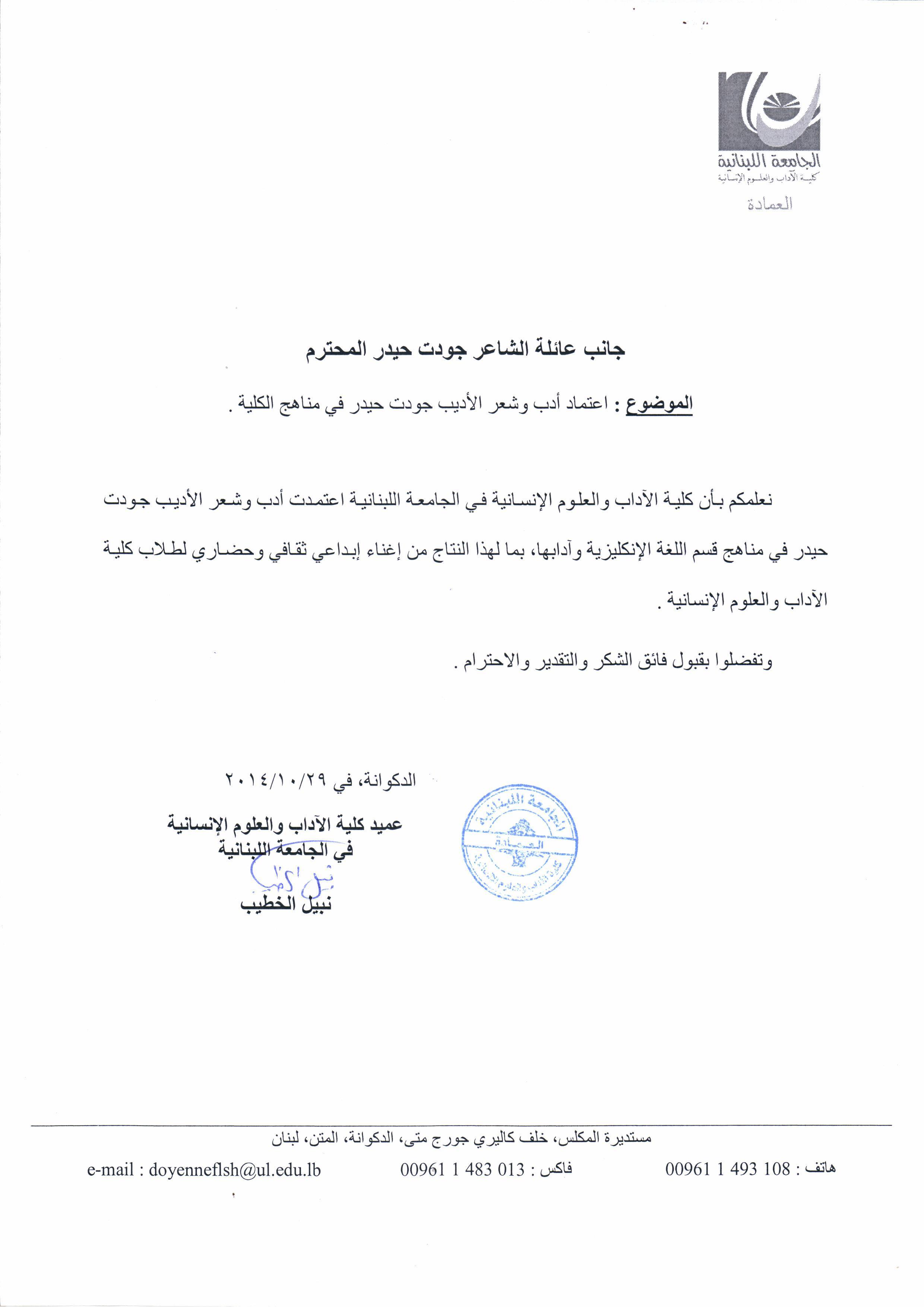• Haydar's poetry is incorporated into the National curriculum at the Lebanese University. click here to see the decision.